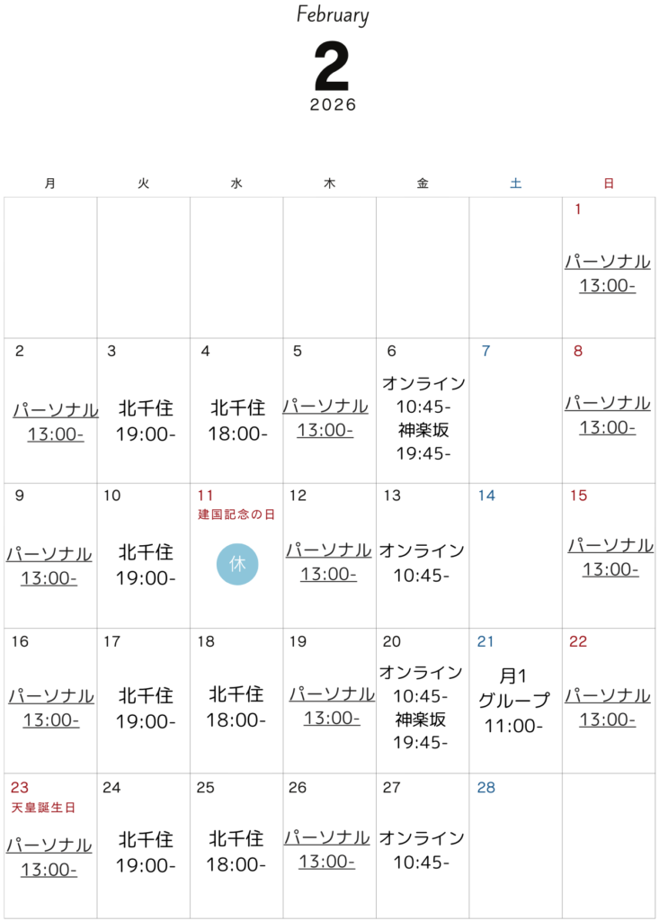 2月スケジュールカレンダー 2026 01/07 Published 2026.01.07 / YOGA BASE LAB \ この記事を共有 / B! リンクをコピーする 2月スケジュールカレンダー YOGA BASE LAB B! リンクをコピーする 2/11(水)北千住グループクラスは祝日のためお休みになります。